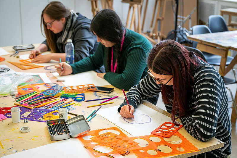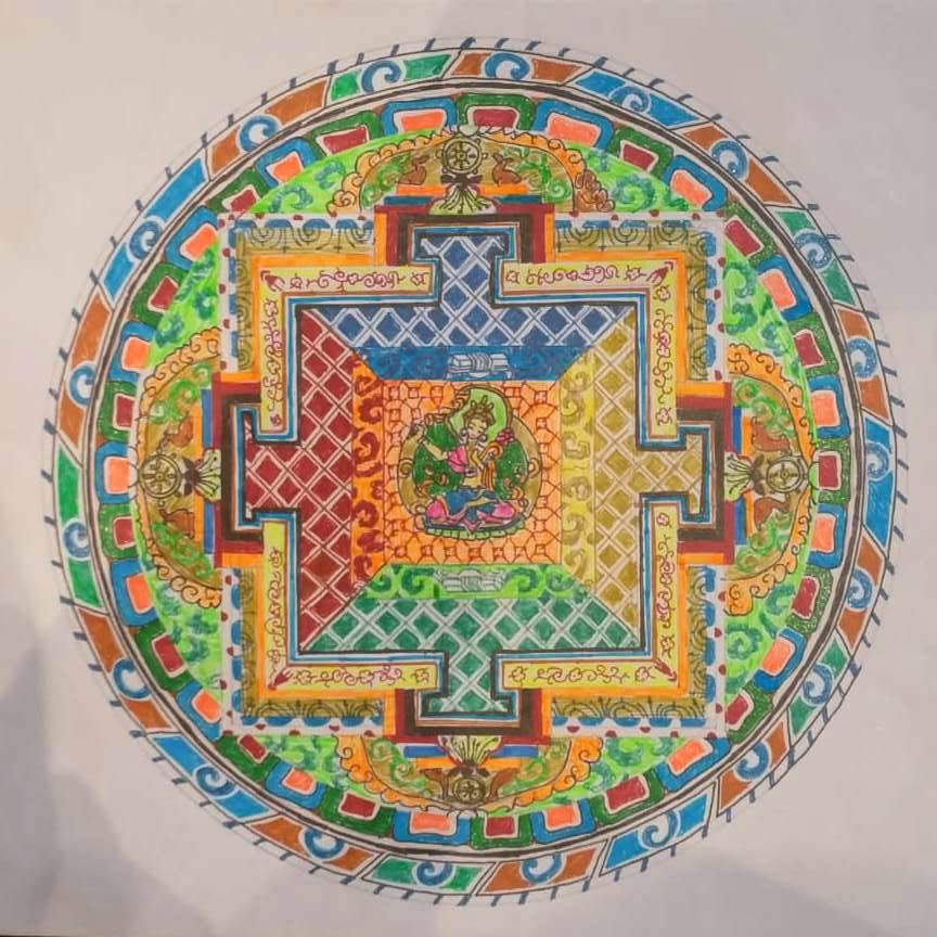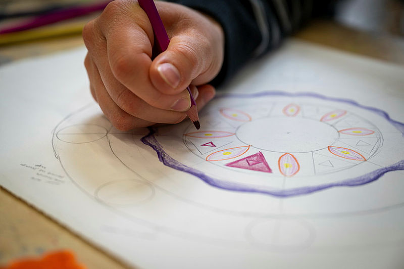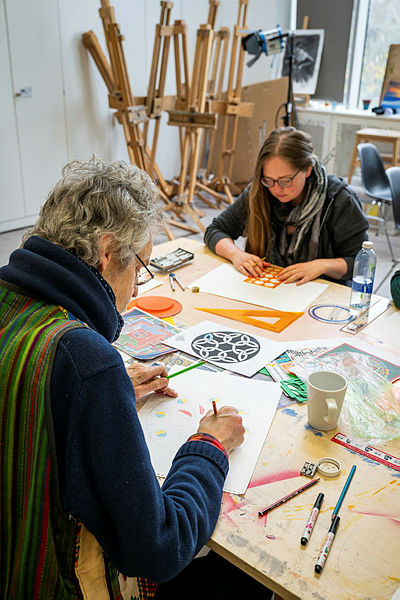 Mindful Art is a fusion of mindfulness practice and creating individual designs. Compasses, templates and stencils are provided to assist in drawing the design which can then be coloured in with crayons, paints and ink. The intention behind the class being to encourage sustained immersion in the artwork to the exclusion of other distracting thoughts.